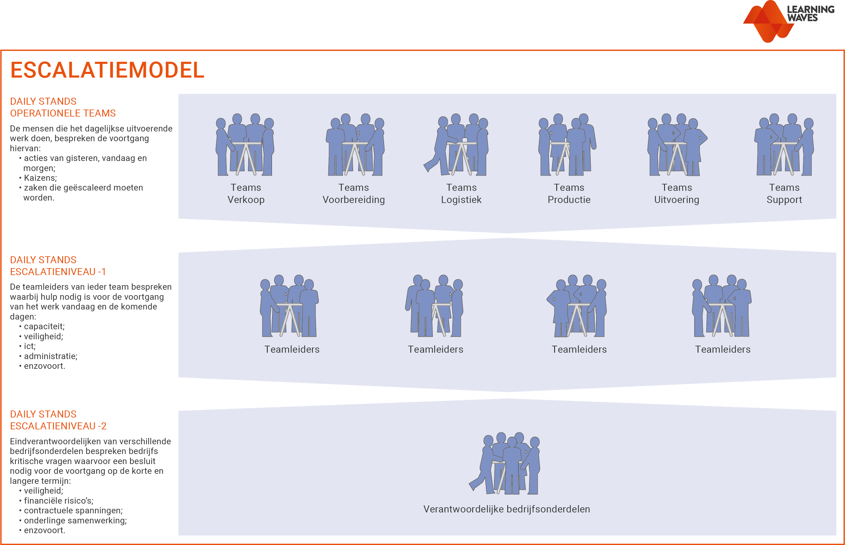 Aanvullend heeft Bolidt de Daily Stands volgens een escalatiemodel ingericht en gepland. Achtereenvolgens op dezelfde dag houden de operationele teams en de managers hun Daily Stand. Op die manier kunnen ze eventuele verstoringen waarvoor beslissingen van hoger hand nodig zijn, binnen enkele uren escaleren.