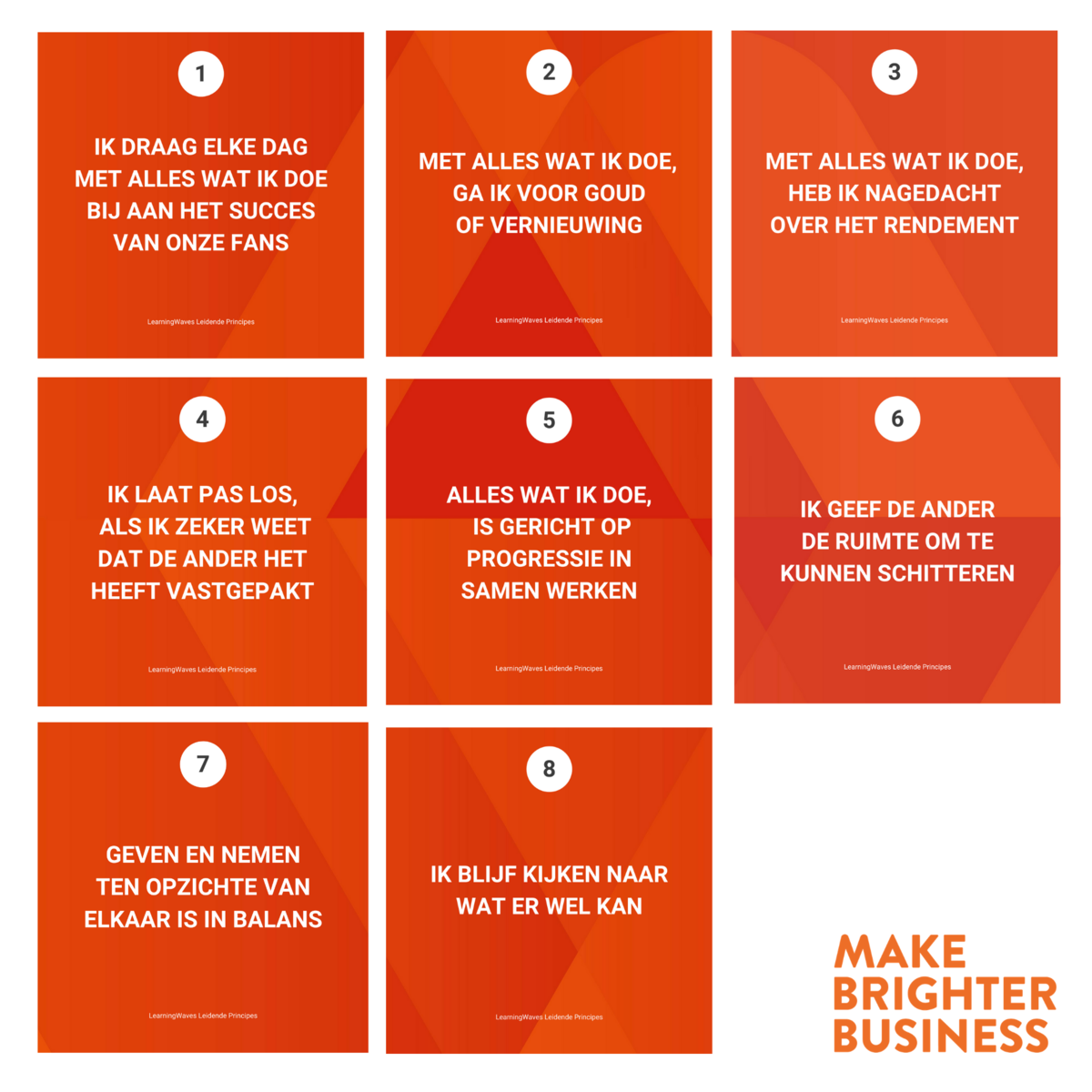 Om te zorgen dat we als collega’s daarin op één lijn zitten, elkaar ondersteunen en zelfs kunnen aanspreken als dat nodig is, hebben we leidende principes geformuleerd. Leidende principes zijn de basisuitgangspunten voor ons gedrag als professional, naar elkaar en richting onze klanten. Ze zijn gebaseerd op waarden en overtuigingen die al lang (onbewust) in onze organisatiecultuur bestaan. Omdat we ze zo belangrijk vinden, hebben we ze expliciet gemaakt. In uitdagende tijden geven ze houvast. We hebben ze in korte, krachtige statements geformuleerd. Je ziet ze hangen bij ons centrale planbord op kantoor.