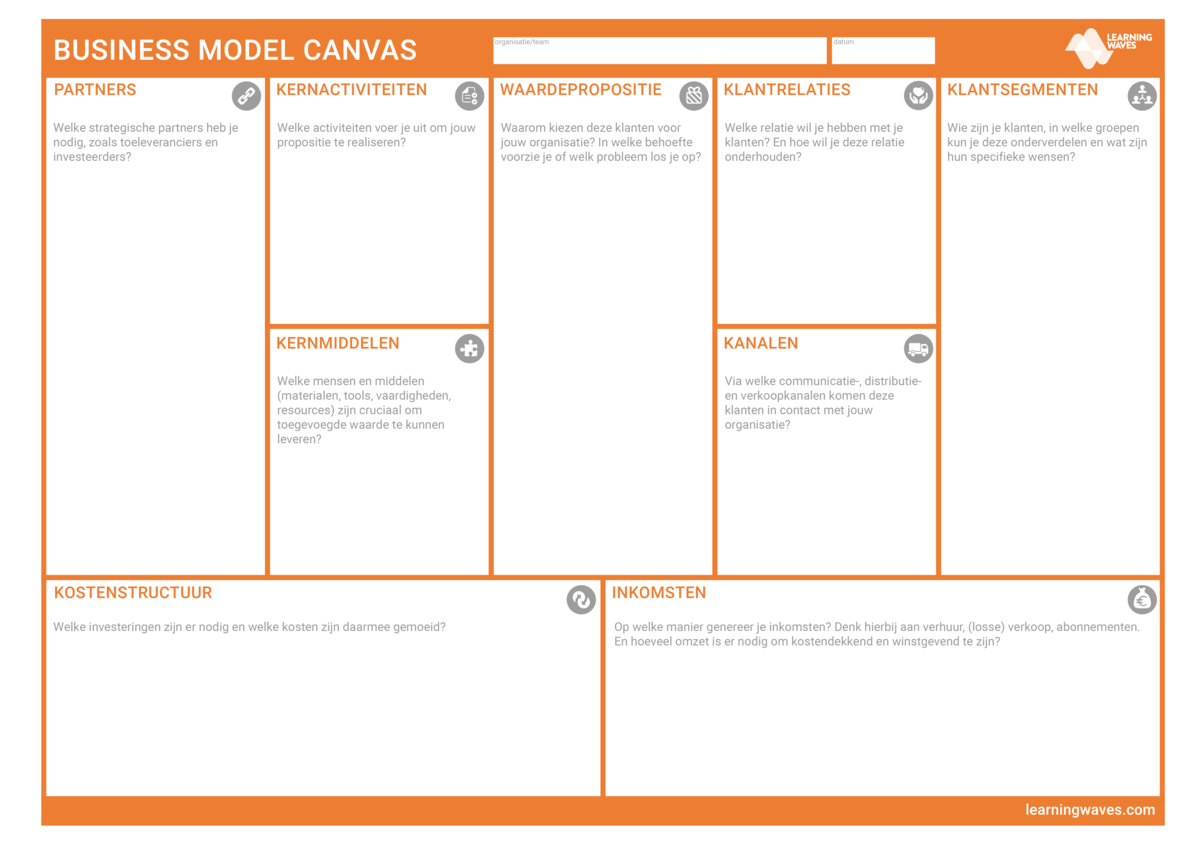 Het is altijd goed om (weer) eens wat afstand te nemen van de dagelijkse praktijk en stil te staan bij wat nu de succesfactoren van jouw organisatie, afdeling of team zijn. Hiervoor kun je ons Business Model Canvas template gebruiken.